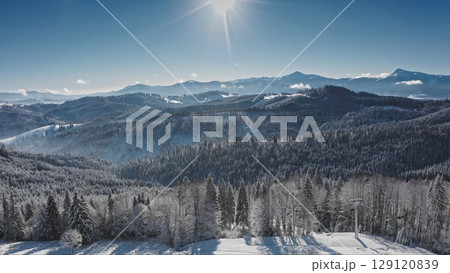 Bright sun shining over beautiful snow covered rolling hills and valleys of the Carpathian Mountains, with a clear blue sunny day sky. Bukovel ski resort. Winter wild nature travel background