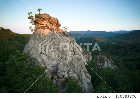 Aerial view of rock formation bathed in warm sunlight among lush green forest and rolling hills. Dovbush Rocks, Carpathian mountains, Ukraine.