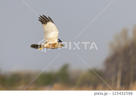 Western marsh harrier (Circus aeruginosus) soaring above golden reeds during a serene morning in a natural habitat