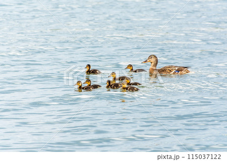 A family of ducks, a duck and its little ducklings are swimming in the water. The duck takes care of its newborn ducklings. Mallard, lat. Anas platyrhynchos