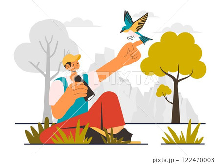 Bird Watching Vector Illustration featuring People Observing Bird in Nature with a Zoologist or Naturalist in a Park or Forest Setting in a Background