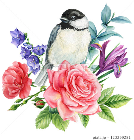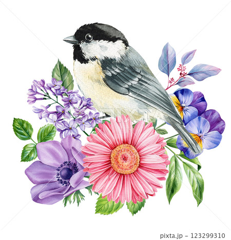 adorable bird with flowers, watercolor tit artwork, hand painted spring cute wildlife illustration, nature flora art