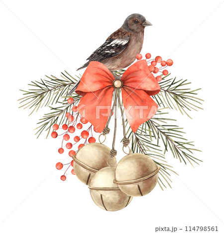 Realistic bird, green spruce, red berries, satin bow and bells. Watercolor Christmas composition in vintage style. Composition for Christmas and New Year holidays, invitations, cards, decoration
