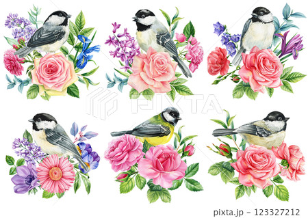 Set beautiful spring birds with garden flowers drawn in watercolor on isolated white, Botanical illustration for design
