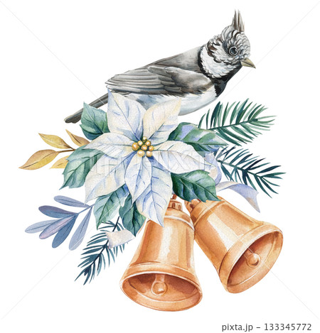 Watercolor songbird with white poinsettia golden bells fir branches berries winter floral decorative illustration
