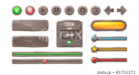 Set progress bars and game buttons ui or gui design elements. Cartoon interface of stone texture. Menu boards, user setting panel with slider, stop, pause and arrows, flash or star keys, Vector icons