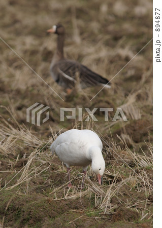 地面で餌を探すハクガン