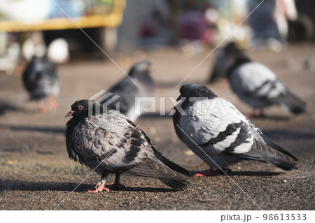 A group of sleepy ruffled city pigeon in the park