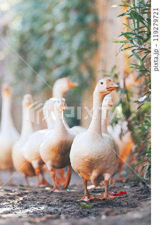 Geese foraging on a sunny farm at midday, showcasing their natural behavior in a rustic setting