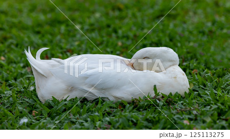 White call duck cute duck white feathers and yellow beak, Call duck is on glass field, Animal life.