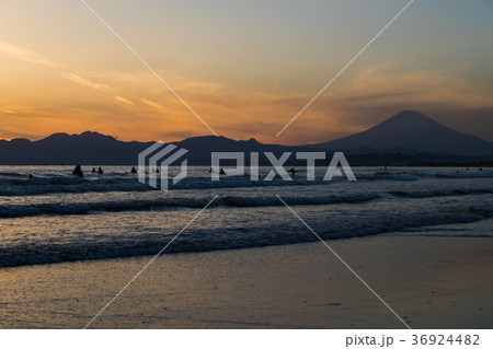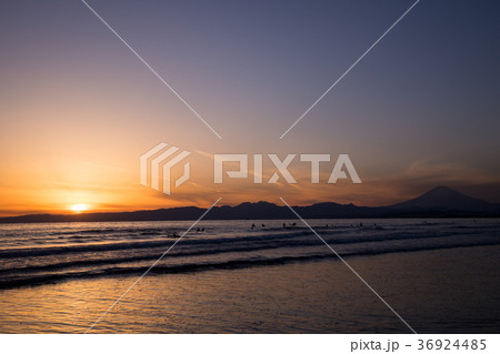 江ノ島 片瀬西浜海水浴場の夕景と富士山(神奈川県藤沢市)