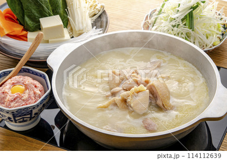 鶏ガラで出汁を取り鶏の脂がいっぱい浮いてる鍋