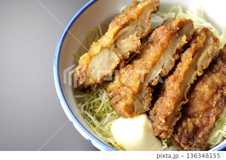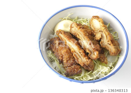 マヨネーズとからあげ丼を白背景で撮影