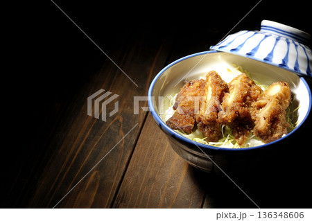 温玉のせ唐揚げ丼を黒背景で撮影