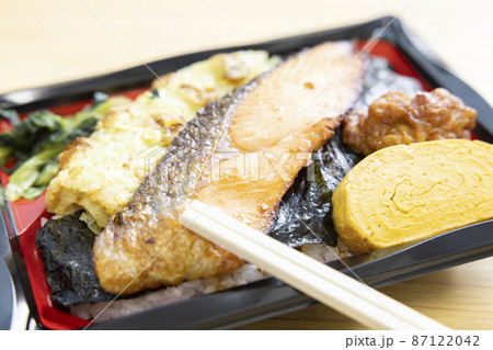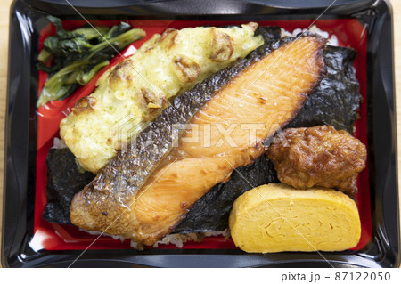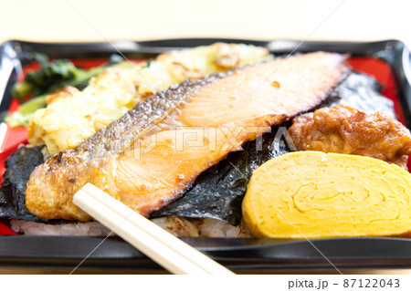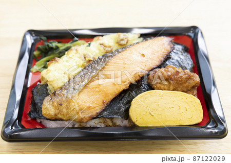 焼き鮭と竹輪磯辺揚げと玉子焼きと鶏の唐揚げが入った美味しい海苔弁当