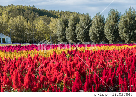 森林公園に咲く羽毛ケイトウの花畑に青空と白い雲