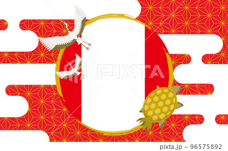 日本らしい鶴亀と和柄をあしらった和風お祝いフレーム素材_横長_赤と金