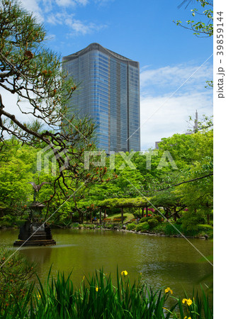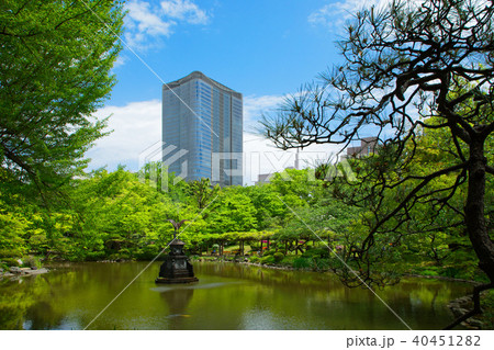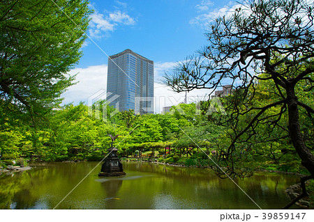 若葉と新緑の日比谷公園の鶴の噴水と東京ミッドタウン日比谷