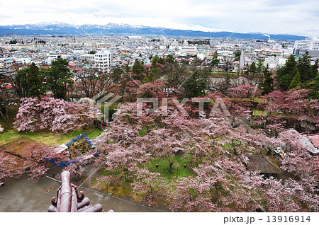 天守閣から望む鶴ケ城公園と湯川ぞいの桜並木