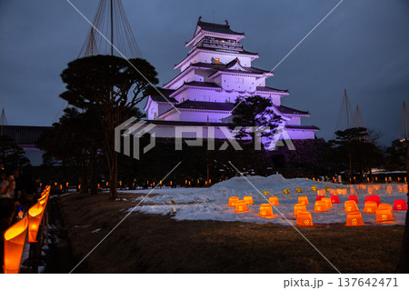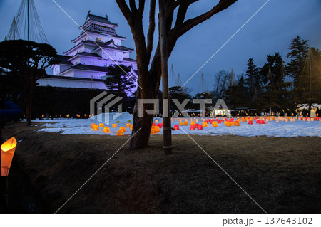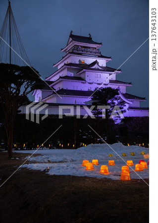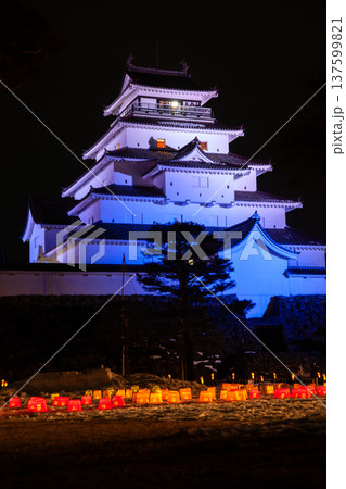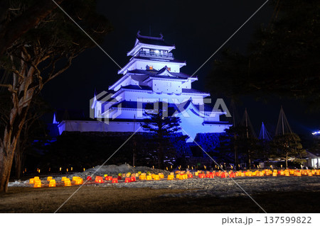 福島県会津若松市のライトアップされた鶴ヶ城(つるがじょう)と夜空の星