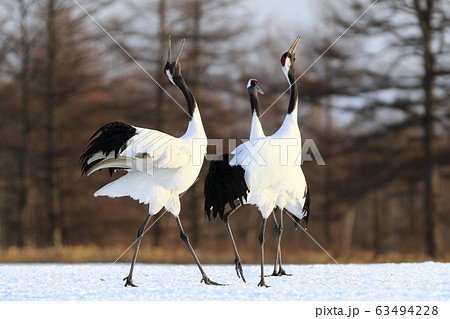 北海道鶴居村で求愛のダンスをするつがいのタンチョウ