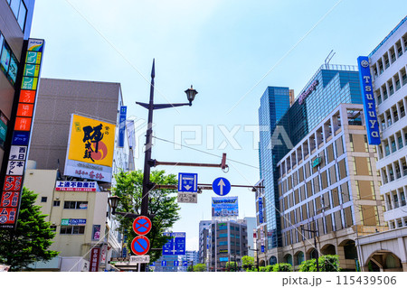 青空を背景に映える繁華街(都市景観) (熊本市水道町・通町筋)