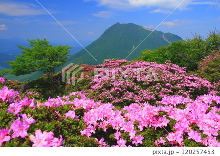 ミヤマキリシマ満開の鶴見岳山頂と由布岳