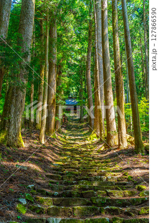 石段を登っていく森の中の神社 氷室神社 山梨県富士川町