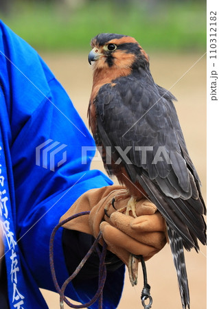鷹匠の手にのるオナガハヤブサ 訓練されたハヤブサ