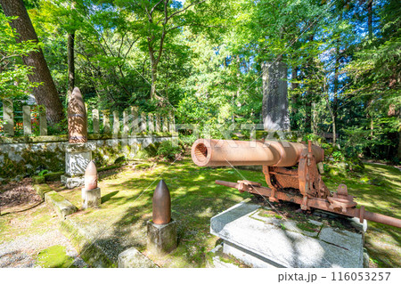 大砲を奉納する春日山神社 忠魂碑 ロシア軍大砲 砲弾