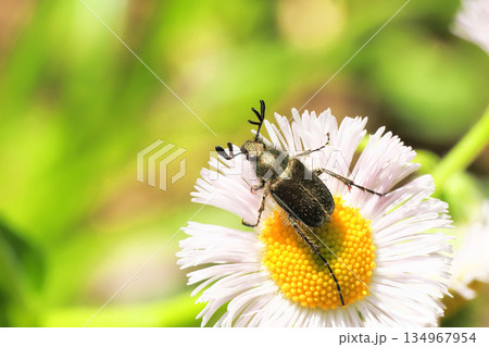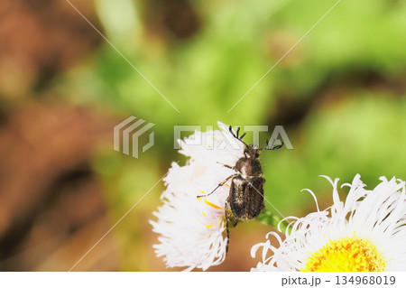 ハルジオンの花に止まるヒゲブトハナムグリ(オス)