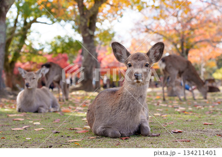秋の木陰で座り込む奈良公園の鹿と群れ
