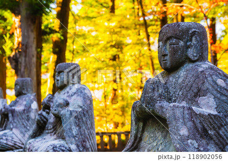 秋の鹿教湯温泉 文殊堂に並ぶ地蔵
