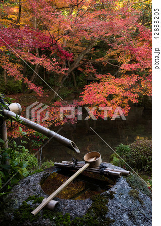 日本的なイメージ 池と錦鯉と竹筒から流れる水