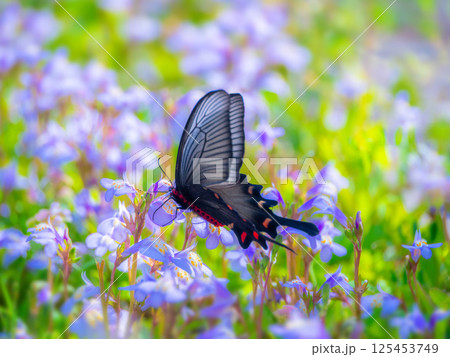 ジャコウアゲハと群生したムラサキサギゴケの花