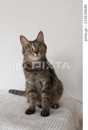 縦方向 白背景、正面に座ってこちらを見つめる猫