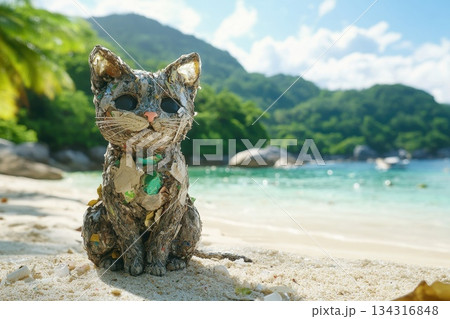 Stray Cat Sculpture Made From Discarded Plastic Straws on Beach by Clear Water