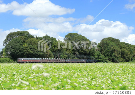 蕎麦畑を前景に力強く煙を吐きながら走るSLもおか号
