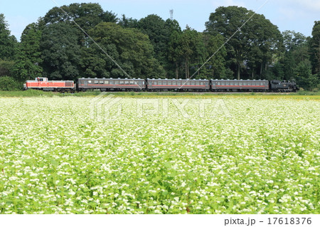真岡鐵道「蕎麦畑の花咲く沿線風景を走る列車」