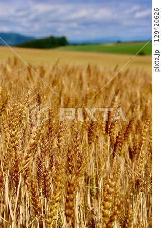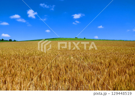夏の爽やかな北海道美瑛の丘の麦畑の風景