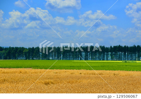 爽やかな夏の北海道美瑛町の麦畑の風景