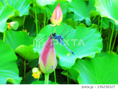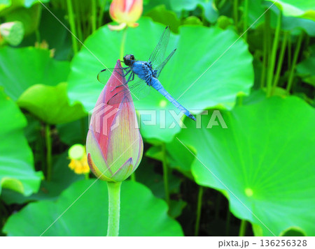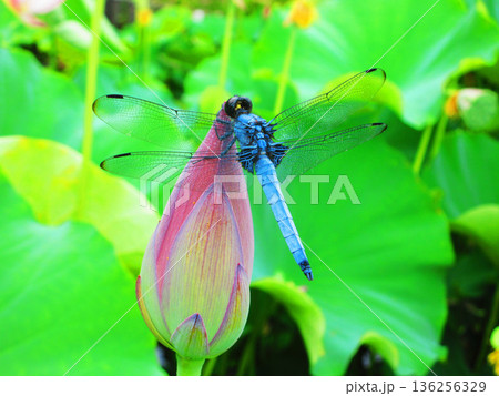 ハスのつぼみにとまる成熟したオスのシオカラトンボの風景