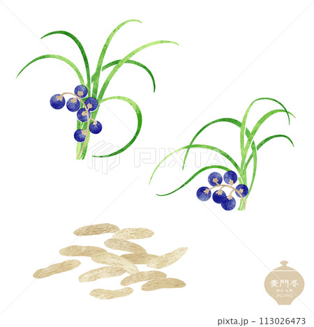 生薬のイラスト/ 麦門冬の実と葉・乾燥根