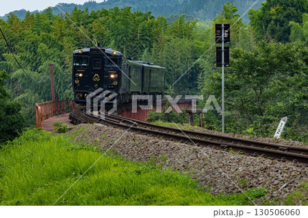 霧のかかる久大本線を行く観光列車「かんぱち・いちろく」(JR九州)