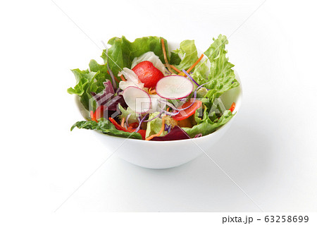 美味しそうなサラダのイラスト。カラフルなたくさんの野菜サラダ。トマト、きゅうり、カブ、とうもろこし