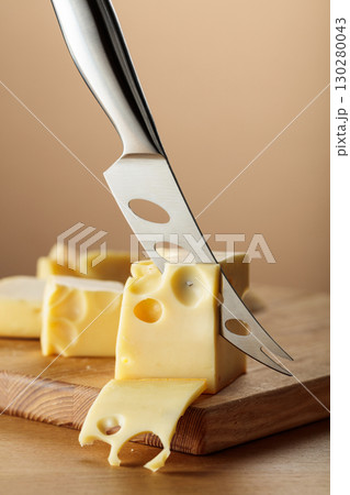 Cheese and knife on a wooden cutting board.