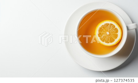 Cup of hot tea with a slice of lemon served on a white saucer on white background. Simple and refreshing warm drink. Minimalist composition.