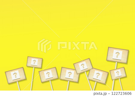 はてなマークが切り抜かれた紙が貼られた沢山の木製看板がランダムに立ち並ぶ黄色い背景