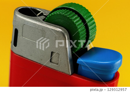Colorful macro of red lighter with green wheel and blue ignition button against yellow background