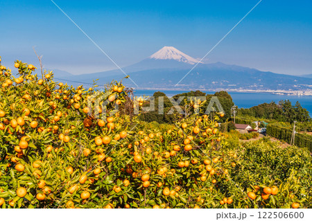 【静岡県】伊豆のみかん畑から望む、雪化粧した富士山